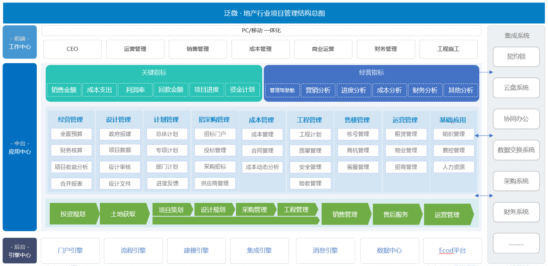 2. 实现地产项目的各环节专业化管理应用,以经营管理、设计管理、计划管理、招采管理、成本管理、工程管理、售楼管理、运营管理为主线;帮助各环节管理,实现科学化、智能化,打造流程化、制度化、规范化管理模式。