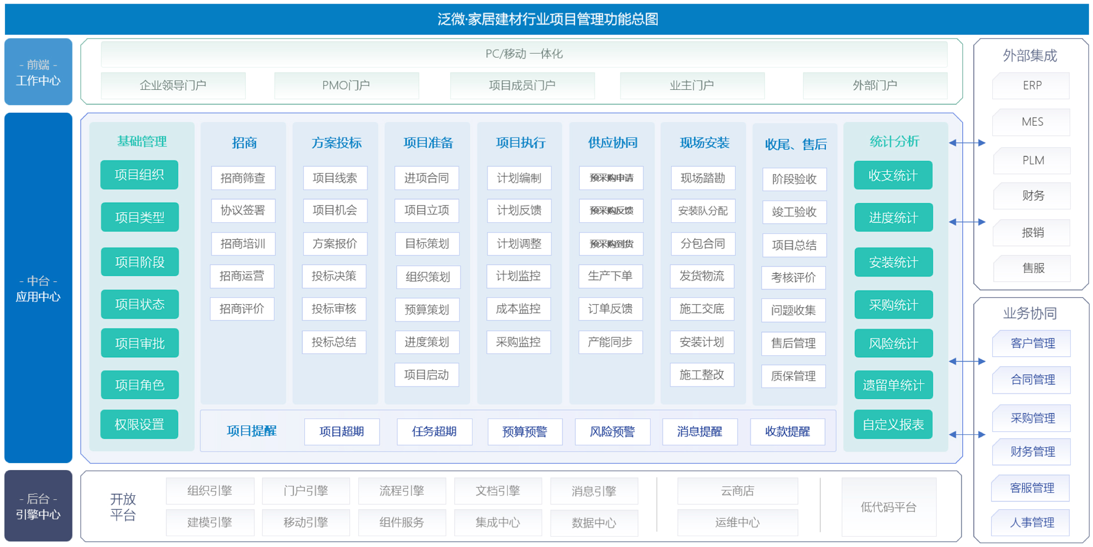 3.以项目协同平台为中心,横向拉通企业内各项管理系统包括ERP、财务、报销、MES、PLM等,事项项目全要素信息集合;围绕项目实现各组织沟通在线、协同在线、信息在线;以项目为单位将各项目相关的所有信息,根据角色权限,聚合推送至个人工作界面,打造个人项目工作中心;以公司视角、项目视角、业主视角、构建不同的项目看板,实现各组织信息同步。