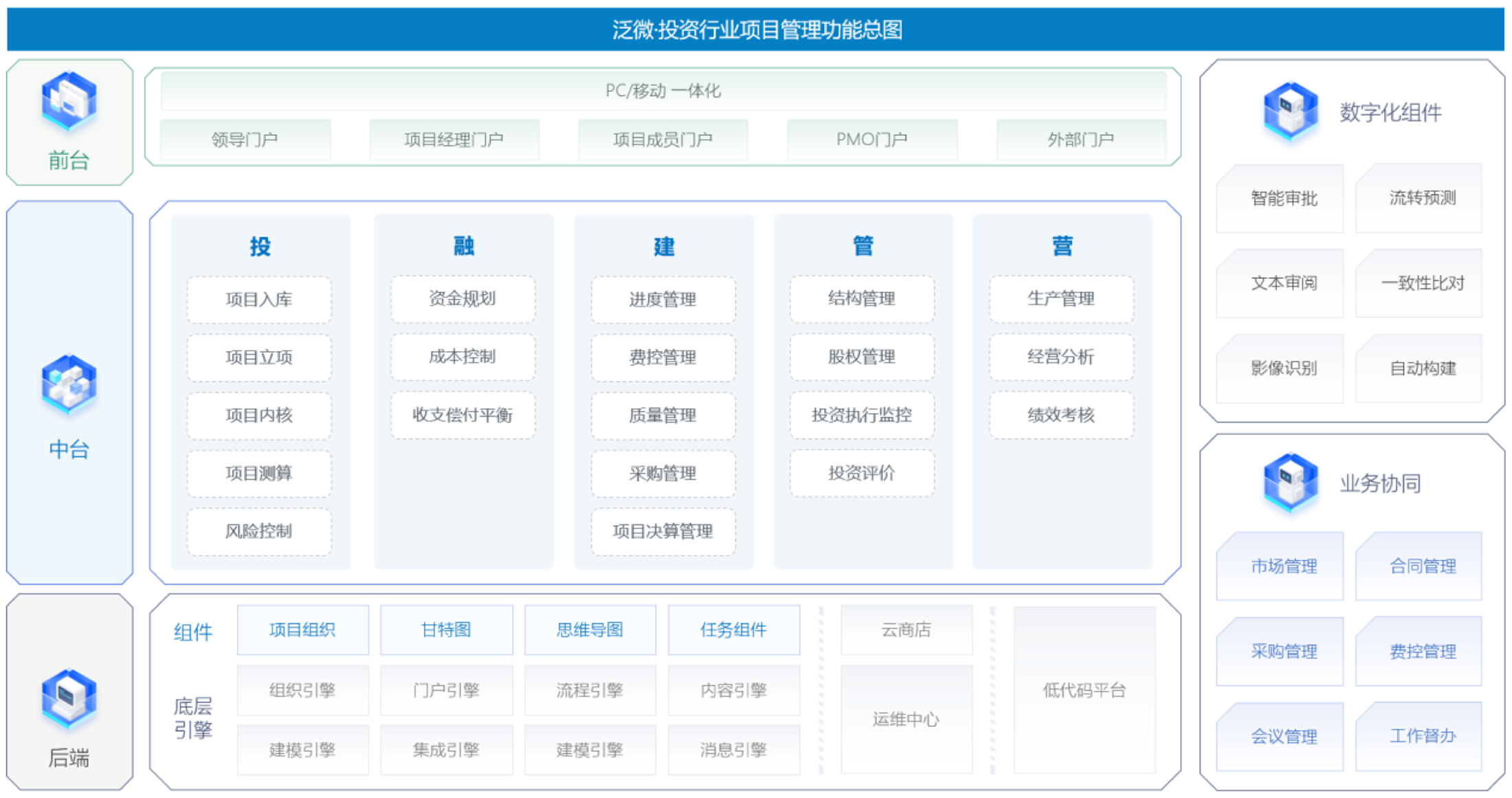 4. 专业化业务工具缺乏:虽然多已部署了财务系统或OA系统,但是缺少业务管理领域应用;缺少为投资行业企业业务应用场景,量身打造的专业化数智化的管理工具。